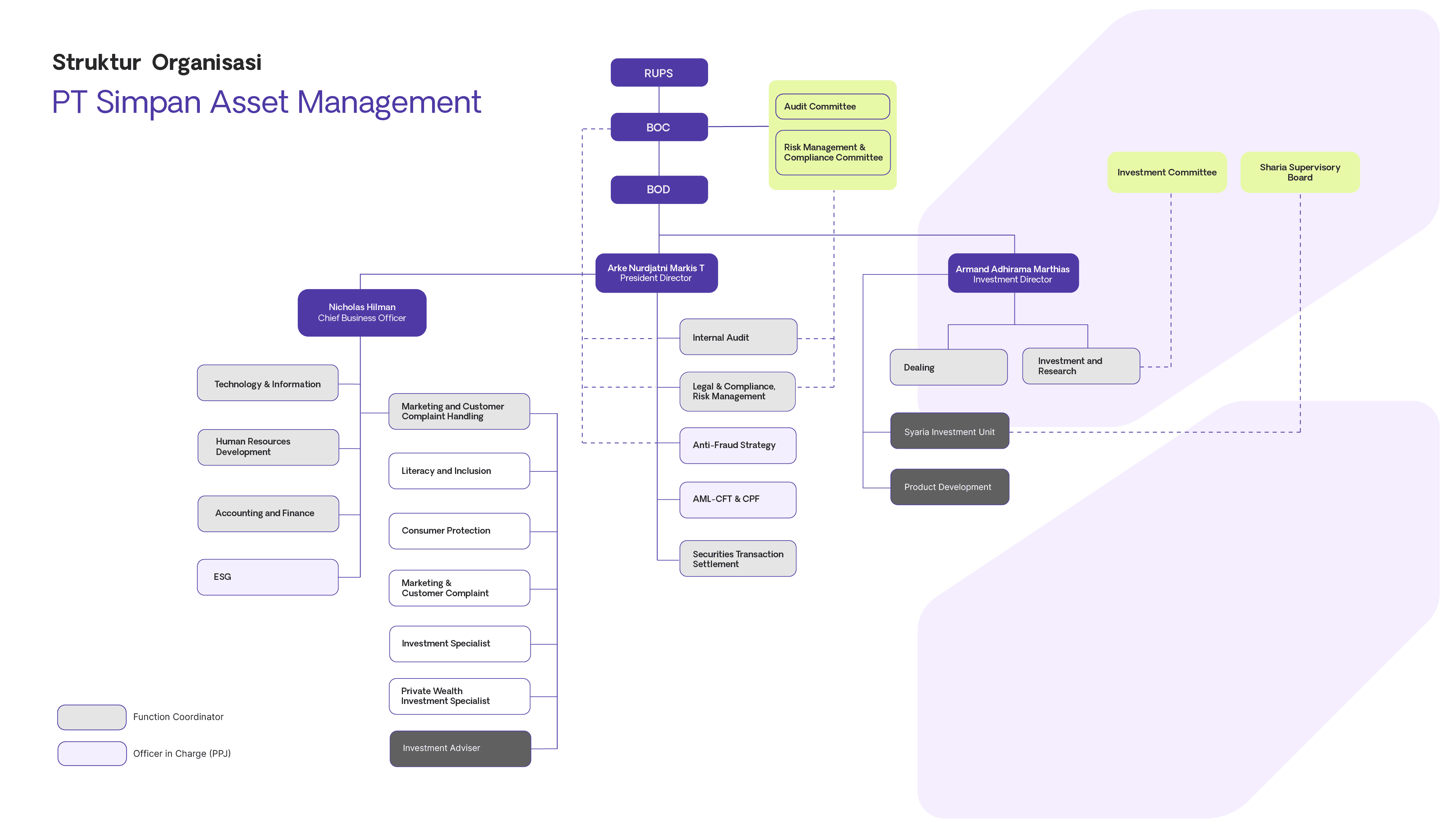 Arke Nurdjatni has more than 25 years of experience in the investment management industry and is a licensed Wakil Manajer Investasi (WMI). She is actively involved in asset management associations and has worked at MNC Asset Management and PNM Investment Management. She earned a Bachelor of Economics degree from Trisakti University and a Master of Investment degree from IPMI, Jakarta.